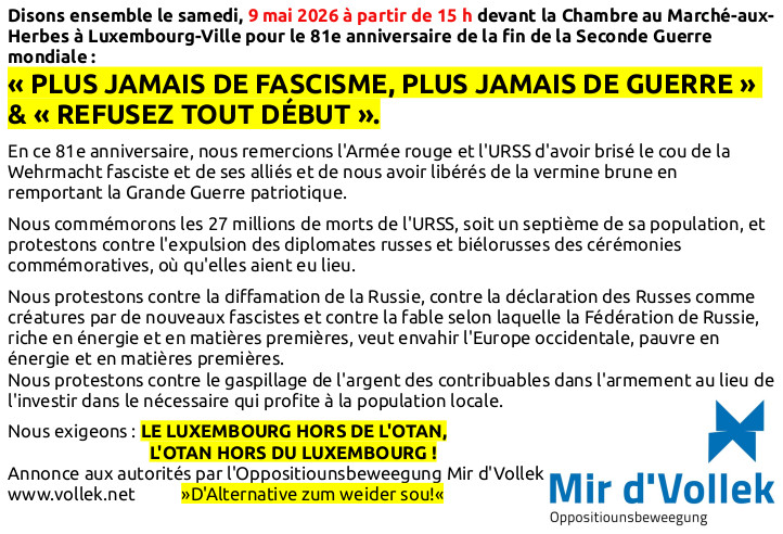 Instead of rearmament at the expense of social welfare, culture, education and infrastructure : Dissolution of NATO or withdrawal – NATO out of Luxembourg – Luxembourg out of NATO ! Put an end to anti-Russian sanctions and to support for the fascist regime in Kiev and the Bibi Corruptus government in Israel!