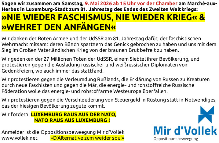 Statt Aufrüstung auf Kosten von Sozialem, Kultur, Erziehungswesen und Infrastruktur Auflösung der NATO oder Austritt – NATO raus aus Luxemburg – Luxemburg raus aus der NATO ! Schluß mit antirussischen Sanktionen und der Unterstützung des faschistischen Regimes in Kiew sowie der Regierung Bibi Corruptus in Israel!